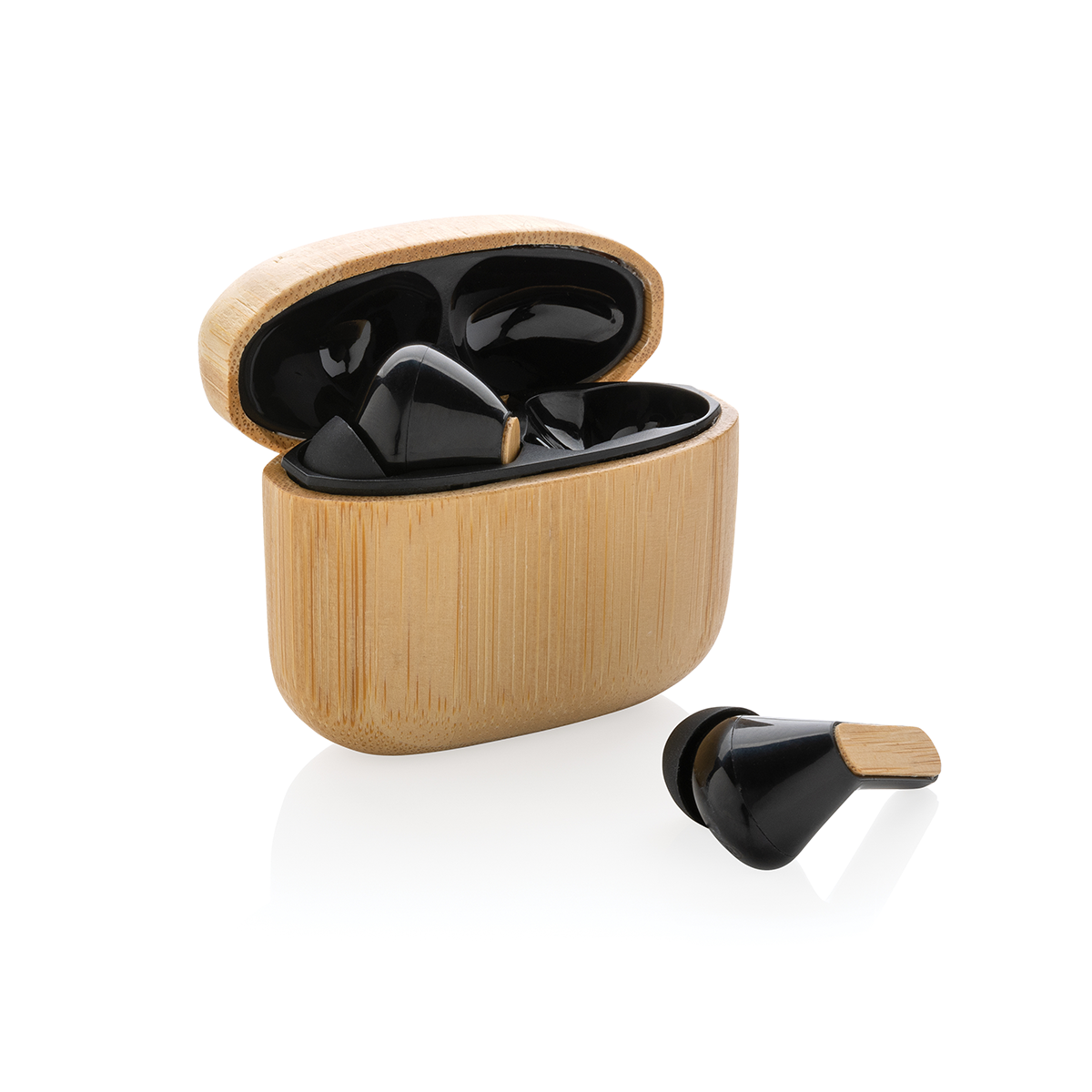 Bežične bluetooth slušalice s funkcijom hands-free poziva, sa pripadajućim kućištem za punjenje od bambusa. Sadrži USB kabel.